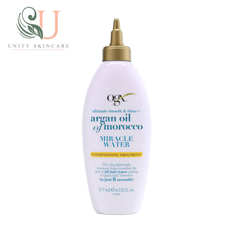 محلول میراکل واتر نرم کننده OGX برای انواع موهای خشک، کدر، آسیب دیده، رنگشده یا دارای موخوره مناسب و قابل استفاده بوده و شادابی و طراوت طبیعی موها را بازیابی نموده و تنها پس از یک بار استفاده، نرمی و لطافت محسوسی ایجاد میکند. مصرف منظم این محصول، استحکام و مقاومت تار مو را افزایش داده، بافت آن بهبود می بخشد و جلوهای براق و ابریشمی به مو می بخشد